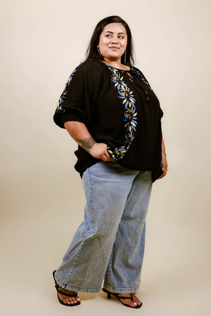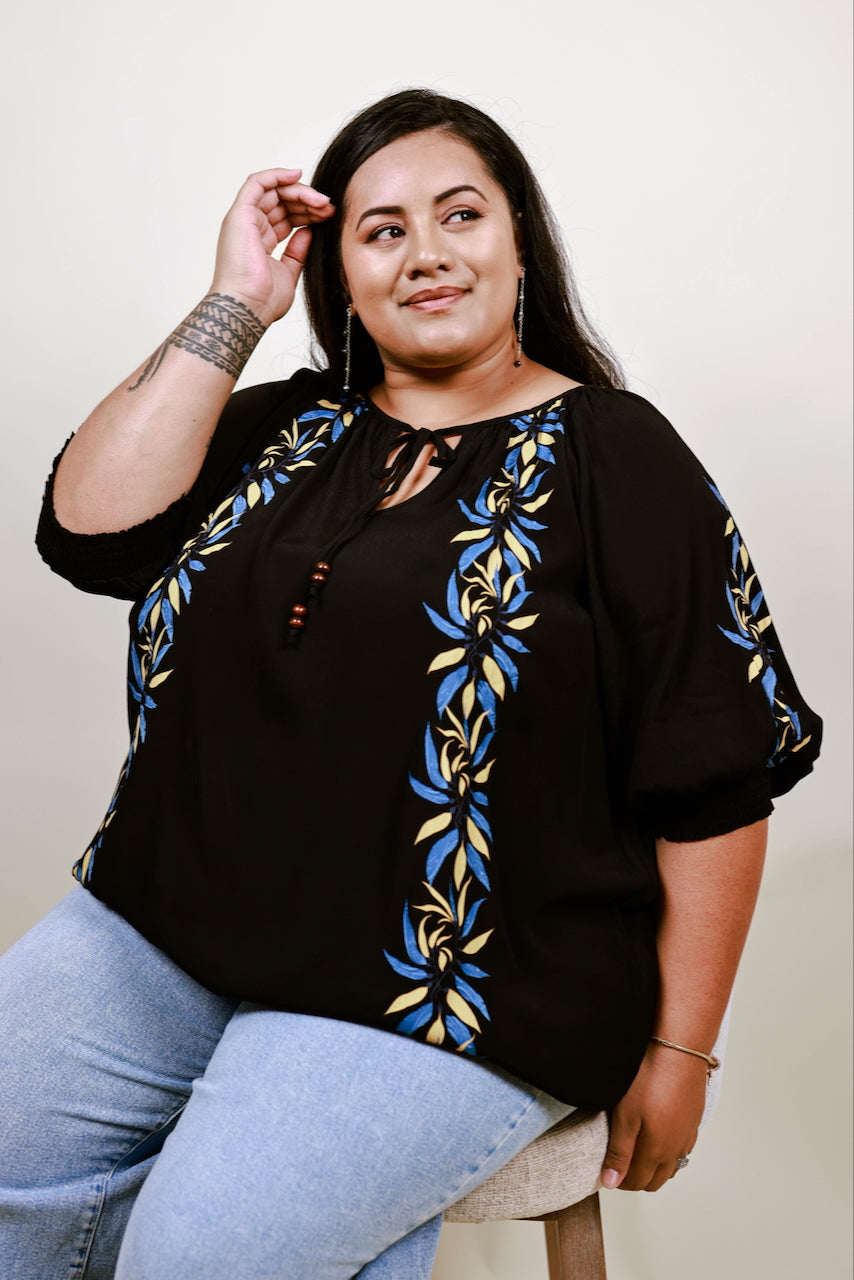 The perfect mix & match top that will last every season. Our Tula Ladies Top has a beaded tie detail neckline with a key-hole notch, a relaxed fit bodice, and billowing sleeves with smock detailed hems. Pair this top with our matching Tula Ladies Skirt, or with your favorite pair of pants. Check out our Tula Collection for more styles for you and the whole family.