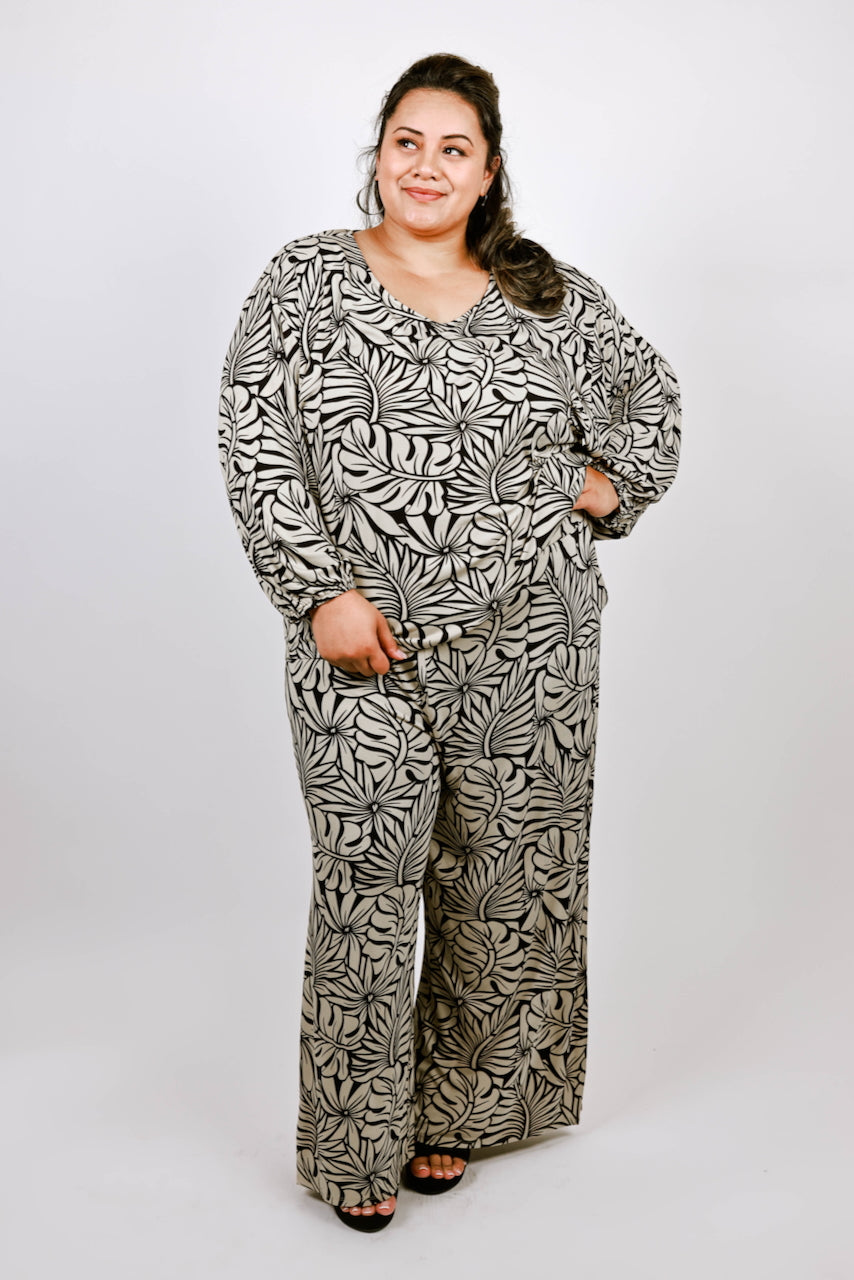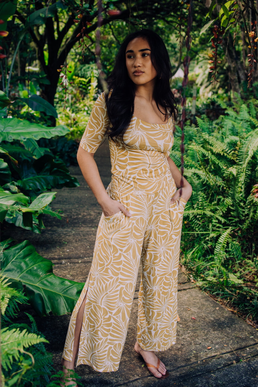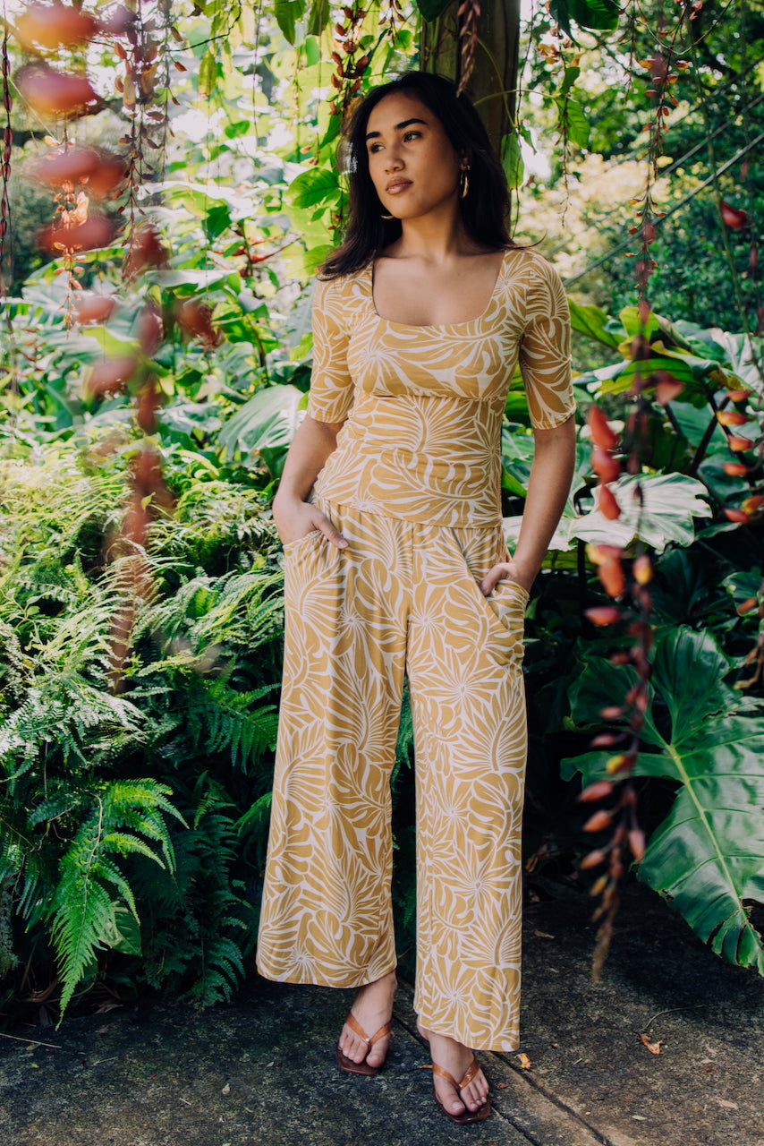 Bringing back our comfy Gaucho Pants in our Elei Lau Niu print! These pants feature a smocked waist, and a slit at the ankle that can be tied or worn as is. Pair our Elei Lau Niu Gaucho Pants with on of our Elei Lau Niu Tops for a matching set look, and check out our entire Elei Lau Niu Collection to match with your loved ones!