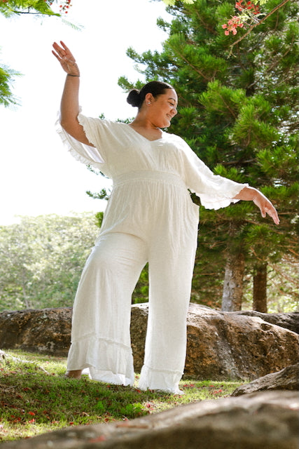 Turn heads wherever you go in our Paleasina Jumper! Our jumper features a v-neck neckline, drop shoulder flutter sleeves with a ruffle hem, an elastic empire bust with tie, wide leg pants with a ruffled hem, and our beautifully understated Paleasina print.